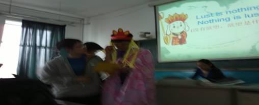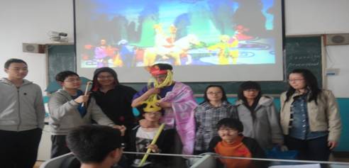 2011级经济管理学院会计1班王宁、田昊、于洋等同学于2012年4月19日英语课上进行了英语话剧表演——“新三打白骨精”,取得了很好的效果。学生精心改编了经典片段“三打白骨精”,加入了斗地主、流行语等现代因素,并制作了幻灯片,还加入了现代音乐、西游记的主题曲等等。演员精心编排了武打动作,丰富了故事情节,自制的道具使整个话剧更加形象生动。整个话剧诙谐幽默,演员的表演十分到位,使同学们在开怀大笑的同时也练习了英语口语和听力,也使演员们增强了英语表达的自信并提高了表演才能。这次英语话剧演出对于学生来说是一个很好的锻炼机会,使他们意识到学习英语不只是为了应付考试,更重要的是应用实际交际中,从一点一滴学习英语、练习英语,才能实现学英语的真正目的。