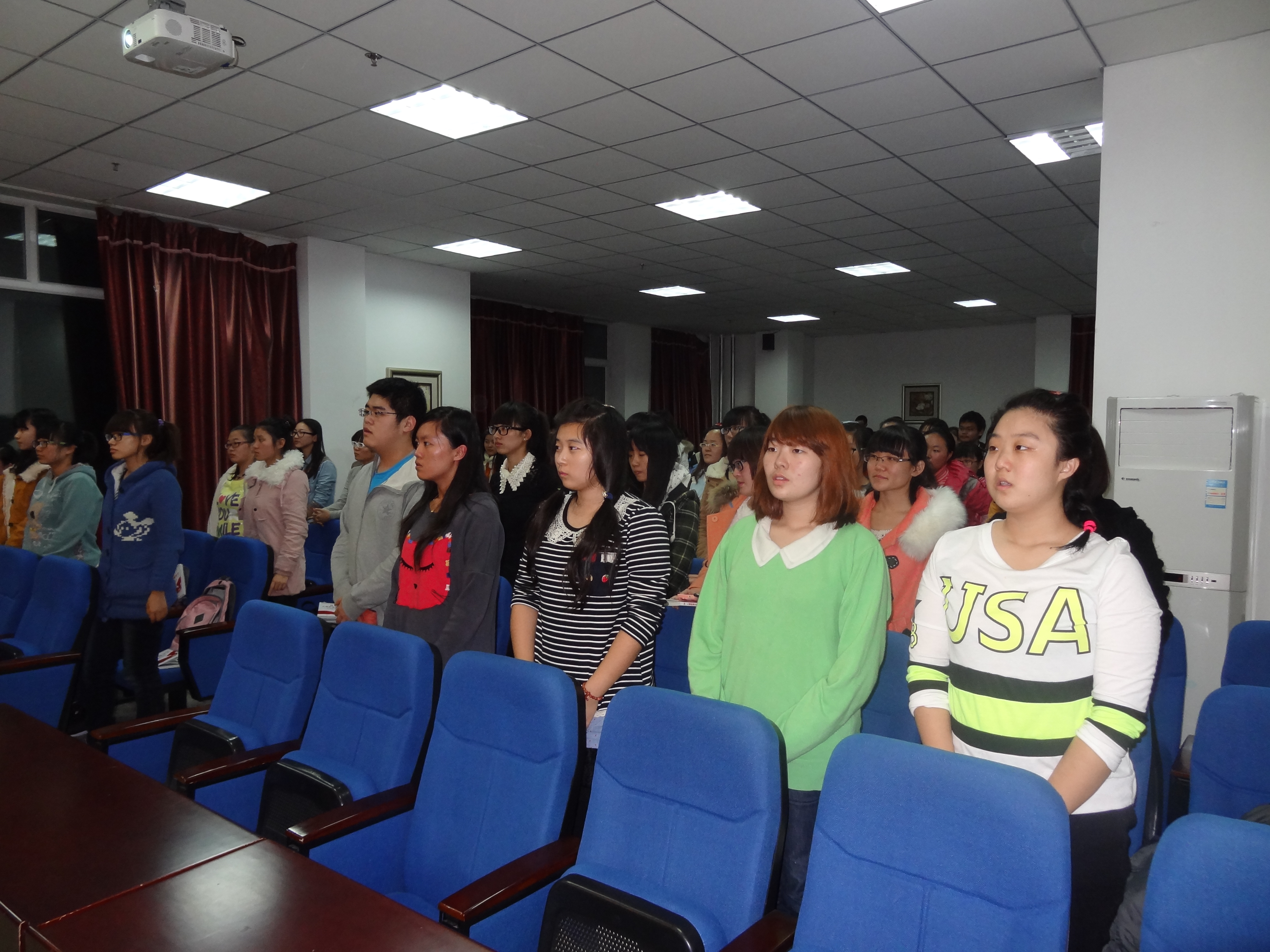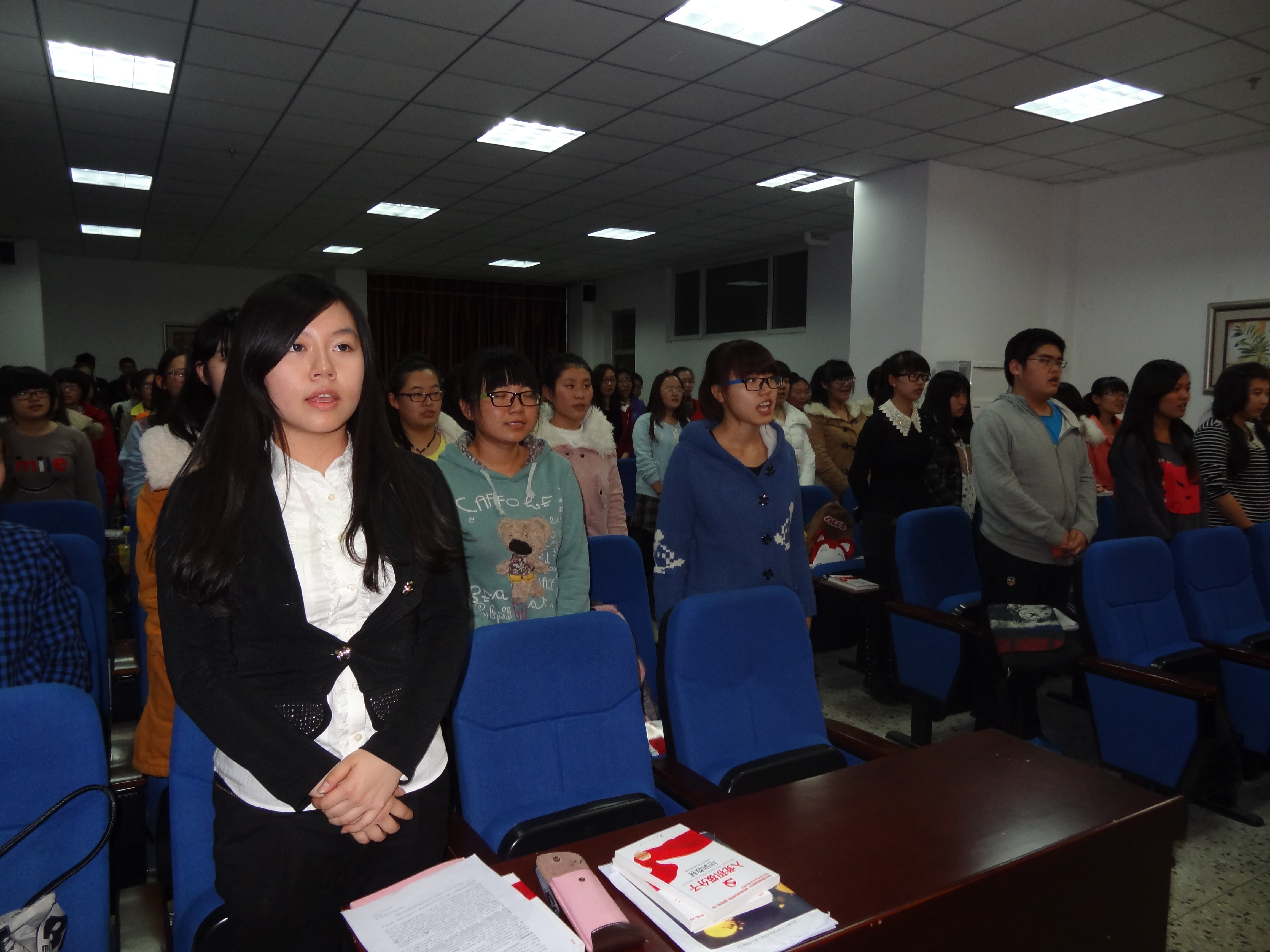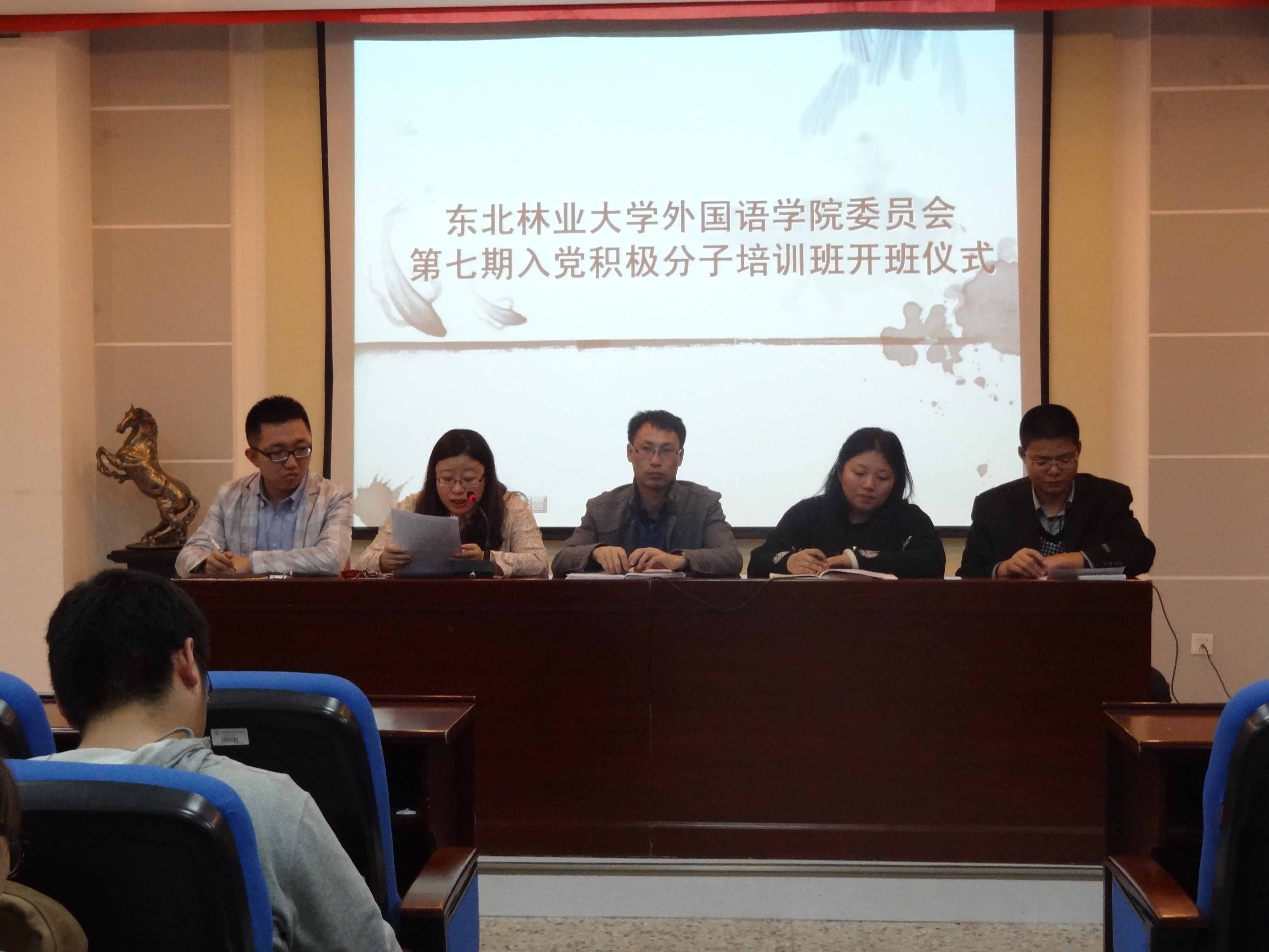 18时整,开班仪式正式开始,全体师生起立奏唱国歌。首先学院团委书记郭林老师向学员们宣读了此次培训班的课程安排,之后,2012级政治辅导员李婧坤老师和2013级政治辅导员袁野老师分别向学员们宣读了党校学习的纪律要求和党校工作细则。徐青玄同学作为本次培训班的学员代表上台发言,代表全体学员抒发了对学院党组织的敬爱之情,同时也表达了对本期培训班学习的展望。在开班仪式上,学院党委副书记兼副院长郭永长老师作了讲话,他首先对参加本次培训的学员表示祝贺,并对学员们今后的学习提出了三点期望,希望同学们做好入党的理论知识准备,做好入党的思想认识准备,做好入党的实践行动准备,珍惜党校学习时光,珍惜大学生活,珍惜同学友谊,努力充实自己,对自己的未来负责,对我们的国家与社会负责。最后,张刚老师宣布本次开班仪式结束。仪式结束后,全体学员参加了本次培训班的第一次培训课程。在学院团委书记郭林老师的细致讲解下,大家认真学习了中国共产党的发展简史,进一步加深了学员们对党组织的认识。