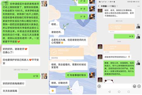 在疫情在湖北等地区爆发严重,辅导员们第一时间与学生视频连线,了解学生家中状况,掌握学生家庭实际困难,帮助受疫情影响严重的家庭经济困难学生申领临时困难补助。辅导员袁野了解一位学生有嗓子疼、头疼等轻微感冒症状,体温正常,因所在地疫情严重,家长无法外出打工,导致其家庭生活压力较大,担心该生由于缺钱不去医院诊断,随即转给学生500元并建议其立即去医院问诊,经诊断,排除新冠病毒感染,仅为一般呼吸道感染。辅导员李欣书的一位学生与母亲相依为命,但因疫情原因,母亲已无法外出工作,让原本不富裕的家庭雪上加霜,在了解到学生的实际情况后,给学生转了500元,希望能帮助学生渡过难关。通过全面摸排,重点关注,即时了解学生情况,辅导员们也时刻搜集学生遇到的问题和困惑,及时反馈给学院,做到各部门联动,解决学生困惑。目前学生反馈的网络问题、经济困难问题、网络软件使用问题情况均得到解决。