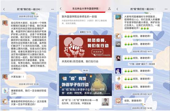 自新冠肺炎在全国多个城市出现,外语学院全体辅导员立即行动起来,迅速将网络作为开展工作的主阵地,第一时间对在外学生进行线上多方联动联系及疫情防疫防控知识宣传。辅导员老师通过召开视频会议、网络班会、学生干部工作会议、特殊群体网上家访及微信聊天等形式开展大学生思想政治工作,工作中做好学生的心里辅导、答疑解惑、稳定学生情绪。引导学生不信谣、不传谣、遵守学校规定,不提前返校,做到休假不休学。学院书记、副书记与全体辅导员和湖北籍学生建立了“抗疫我们在一起”微信群,面对面交流沟通,帮助树立信心,全力解决学生困难。通过学院微信平台,定期发布防疫防控安全知识,同时积极宣传在防疫过程中学院典型事例,志愿服务先进学生事例,鼓励引导全体学生具有积极乐观向上的精神风貌,勇担青春使命,彰显外语学子风采。