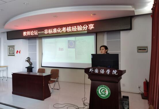 首先,大学外语第二教研室刘娈老师做了以关于《大学英语‘全过程考核——非标准化答案’考试模式探索与实施》为主题的精彩发言。她从课程评价方式,平时成绩构成及考核方式,期末考试方式及实施情况四个方面详细介绍了大学外语非标准化考试工作的开展情况。然后,大学英语第一教研室舒海英老师向大家介绍了以《英美报刊选读》课程为案列的通识教育必修课非标准化考试设计。该课程自开展非标准化考核模式以来,从提高学生应用、产出能力的基本点出发,针对英美报刊选读课程特点,形成了融合翻转课堂、章节测试、期中、期末随堂测试和期末测评的全过程非标准化考核体系,突出了学生学习能动性和产出应用能力培养,从转变考核模式理念,构建全过程考核模式。