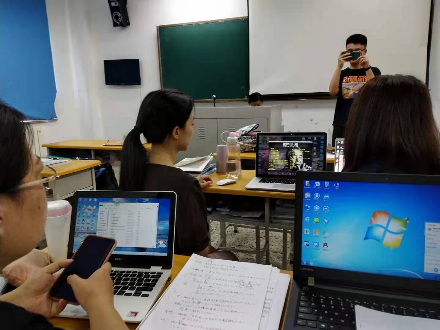 同学们的毕业论文答辩工作都是现场进行,除了一位在外地的同学(由于疫情的影响)以网上答辩的形式进行——用腾讯会议进行视频答辩和PPT共享,用QQ录屏软件全程进行视频录制。首先,由王佳音主任宣布论文答辩开始,然后学生按学号顺序用日语进行论文陈述,教师用日语提出问题,学生用日语回答问题。答辩结束之后,教师与学生们合影留念。