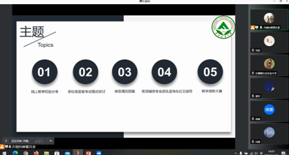 会议开始,齐艳主任邀请本学期9位限定选修课课程组组长进行了线上教学经验分享,各位组长针对线上教学情况和期末非标准答案考试模式进行了分享发言,对于各位组长提出的某些线上教学问题与困惑,老师们进行了积极讨论。针对下周要进行的期末考试,齐艳主任进行了详细的部署与安排,对于疫情影响下的某些突发状况,向老师们讲解了突发情况预案。然后,齐艳主任号召各位老师继续做好英语辅修专业的招生宣传工作,明确了2018级学生二专业毕业论文撰写的注意事项,要求严格按照时间节点完成论文各部分的撰写工作。最后,齐艳主任向各位老师介绍了关于举办教师教学创新大赛的通知,鼓励各位教师积极参赛,锤炼教学基本功。
