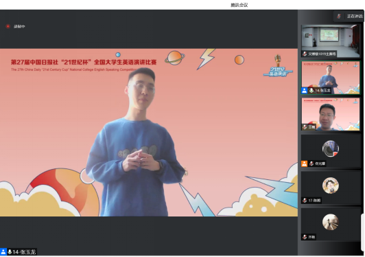 此外,本次比赛锻炼了学生独立组织活动的能力。由于绝大部分教师都在校外,还要最大限度地精简人员,本次校园赛仅邀请四名学生志愿者作为赛事工作人员,分别是担任总协调和英语主持的蔺柯秀(英语2019级4班),负责协调设备的刘璐(英语2018级4班),提供技术服务的信海渤(英语2021级3班),协调组织选手的杨静影(英语2021级4班)。他们在主管教师的远程指导下,分工协作,精诚团结,主动作为,克服种种困难,圆满、出色地完成了赛事服务工作。