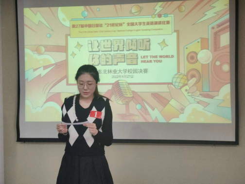 2022年4月27日下午,第27届“21世纪杯”全国大学生英语演讲比赛东北林业大学校园赛成功举行。本次校园赛由best365官网best365官方网站登录入口主办,英语系承办,邀请到齐艳副教授、祁玉龙副教授、柴静老师、王楠老师和外籍教师Ben Watson(白文龙)担任评委,赵莉教授任评委会顾问,Ben Watson为点评嘉宾,佟光耀老师任评委会秘书。“21世纪杯”全国大学生英语演讲比赛是英语教育界一项历史悠久的经典赛事,由中国日报社主办,二十一世纪英语教育传媒承办。本次比赛吸引best365官网120余名学生报名参加,经过网络审核、初选评审,共有18位选手入围校园赛。