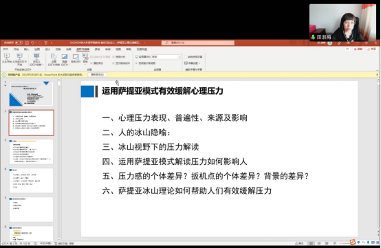 线上教学期间,各位教师处于多重身份转换的状态,承受了许多辛苦和压力,因此学院邀请心理学专家田淑梅教授为大家进行此次讲座。田淑梅教授是贝曼萨提亚中国管理中心认证萨提亚模式培训师,拥有30年的心理学教学和心理咨询临床经验。