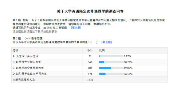 为了解本学期大学英语限定选修课教学的相关情况,了解学生对限定选修课教学质量的评价和意见,大学英语第二教研室于2022年5月19日—5月20日开展了关于大学英语限定选修课的问卷调查活动。