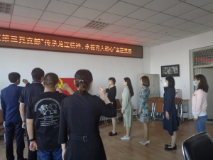 在雄壮的《义勇军进行曲》的伴奏下,本次主题党日活动以齐唱国歌拉开帷幕。张鸣瑾带领全体党员面向党旗,重温入党誓词。