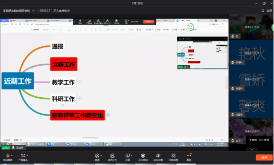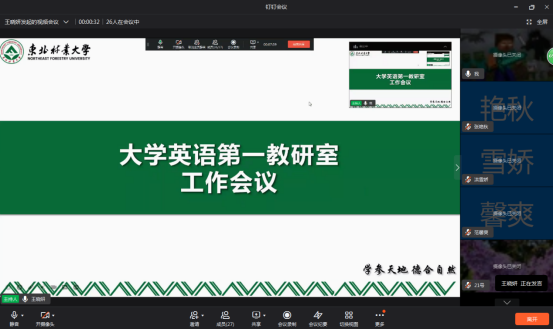 2022年6月2日13点30分,大学英语第一教研室以钉钉会议形式举行工作会议。本次会议由教研室主任王晓妍主持,全体教师参会。