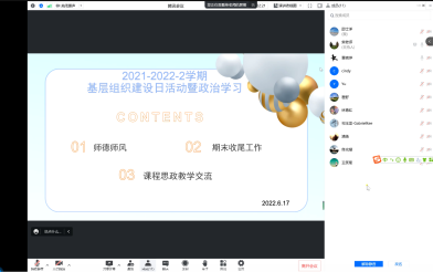2022年6月18日19:00,best365官方网站登录入口英语系教师在线上组织召开基层组织建设日活动和政治学习活动。本次会议由教研室主任柴静主持。