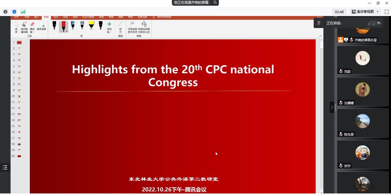 2022年10月26日下午13:40,大学英语第二教研室全体教师在线上参加了本月的基层组织建设日活动,本次活动由教研室主任齐艳主持。