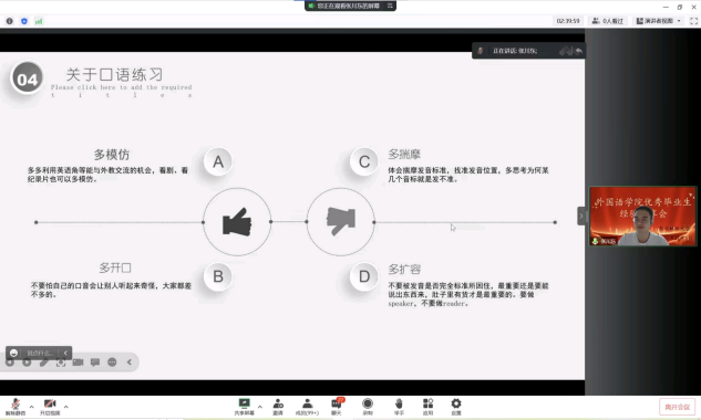 张川东学长则以一段流利标准的英文自我介绍向学生们展示了他在东林优异的学习成果,苦甜参半的大学体验让他对自主考研充满动力,他细致地介绍了考研的基本方向和须知的信息,用自身行动践行了他的寄语:“荆棘已尝遍,白云山麓见。”
