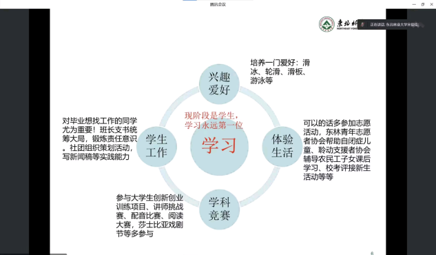 人间十月有幸事,落叶与风再相逢。金秋时节,在东林度过美好的大学时光后,学长学姐们怀揣着硕果重新回到母校,以自身经历向迷茫的大一新生给予建议。best365官方网站登录入口优秀毕业生经验分享会于2022年11月5日18:00-20:45在腾讯会议顺利召开。分享会由英语系主任柴静老师主持,best365官方网站登录入口第二课堂活动负责人赵莉老师应邀出席分享会。best365官方网站登录入口英语专业大一新生全体、来自兄弟院校河南城建学院、哈尔滨剑桥学院、黑龙江工商学院的部分同学共300人参加了分享会。宋佳佳、杜铭、杨薪颖、刘璐、常相荣、张川东六位优秀的学长学姐们以“如何度过大学生活”为主题,为大一新生带来了经验分享,以此来帮助大一新生更好地度过大学生活。