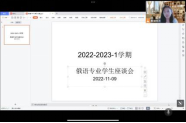 金晓满主任向各年级学生代表了解了当前各门课程线上教学进度,为下一步专业及学院调整教学安排获取及时信息。随后,各个年级的同学就目前存在的疑惑进行了提问。2019级毕业班同学主要就论文开题时间、形式要求等提出了问题;2020级的代表集中反映进入高年级俄语听、说训练欠缺,希望能够以第二课堂的形式进行补充,也希望老师在课上帮助复习和整理学过的语法,部分有考研打算的同学询问夏令营情况;2022级的同学主要问题集中在基础俄语(一)的教学进度,因为22级新生刚刚入学,还处于过渡时期,对俄语学习还需适应,部分同学感到语法学习有难度,单词背诵困难。专业学生所反映的学习环境问题集中在专业教室计算机和投影仪故障较多,2019级同学希望学院能够为大四学生提供一间用于考研复习和求职面试的教室。以学生代表们提出的问题和疑惑为基础,系主任及所有参会老师对各类问题进行了回复,解答了同学疑惑,并将需要进一步沟通的问题进行了记录,向上级主管部门进行汇报。通过此次线上座谈会,任课老师及学院能够更好地了解现阶段学生的学习及生活需求。