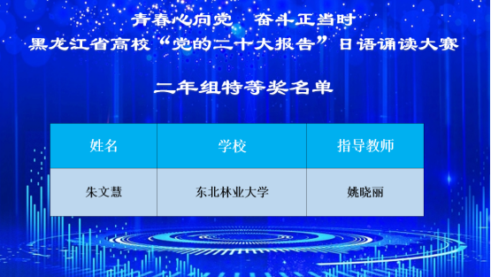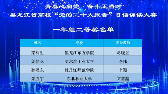 “青春心向党,奋斗正当时”黑龙江省高校“党的二十大报告”日语诵读大赛于12月4日在线上召开。大赛由中国日语教学研究会黑龙江分会主办,牡丹江师范学院东方语言学院承办,比赛指定的诵读内容为“党的二十大报告”(日文版)。best365官网best365官方网站登录入口日语专业21级本科生朱文慧同学荣获二年级组特等奖,22级本科生朱胜宇荣获一年级组二等奖,指导教师姚晓丽、文慧超获优秀指导教师奖。