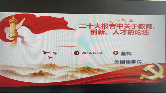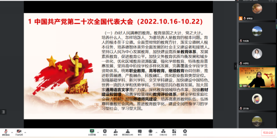 董院长首先为大家解读了报告中教育、创新、人才的相关论述,继而为大家梳理了教育、创新、人才与“中国式现代化”目标之间的关系。最后,董院长介绍了外语教育与学科发展的历史、现状以及未来的发展趋势,并鼓励参会党员作为新时代的外语人要踔厉奋发、砥砺前行,为我国实现以中国式现代化推进中华民族伟大复兴这个目标做出贡献。董院长的党课高屋建瓴,让所有师生党员更加深刻地领会了党的二十大报告精神,同时也更加明确了新时代外语人的使命担当。
