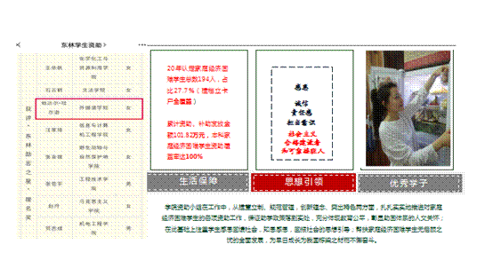 学院资助小组在工作中,从建章立制、规范管理,创新理念、突出特色等多方面,扎扎实实推进对家庭经济困难学生的各项资助工作,保证助学政策落到实处,充分体现教育公平,彰显助困体系的人文关怀;在此基础上注重学生感恩回馈社会,知恩感恩,回报社会的思想引导;帮扶家庭经济困难学生无后顾之忧的全面发展,为早日成长为我国栋梁之材而不懈奋斗。