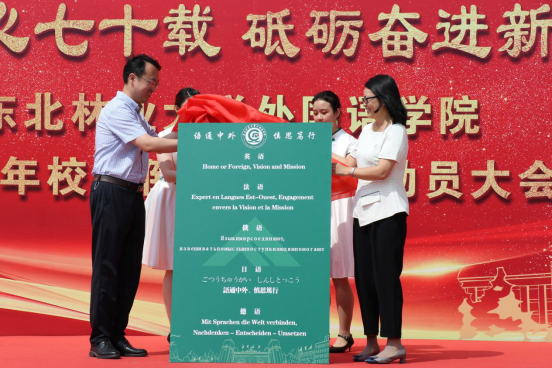 由李明泽处长、董辉院长为best365官方网站登录入口院训揭幕。学院教师代表王清扬、文慧超、孟繁君、李霞、栾慧鑫宣读英、日、俄、法、德五种语言版本院训,阐述了希望外语学子今后在国际舞台上发出中国声音,为东林代言的美好寓意。