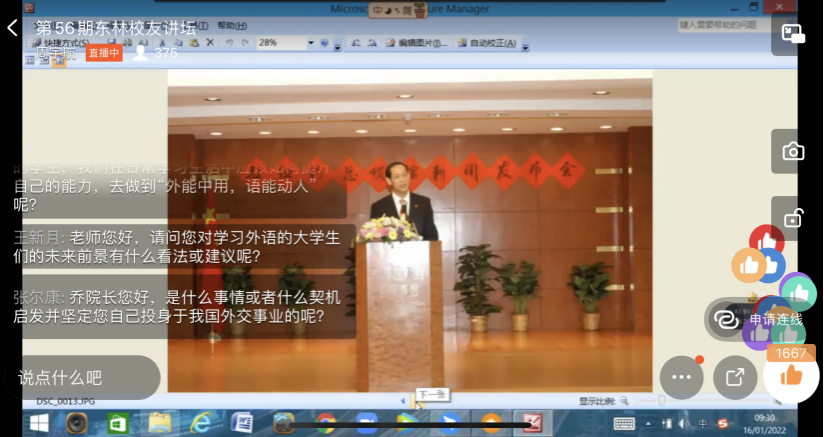 2022年1月16日,中国驻南非大使馆一等秘书,中国认证认可协会(CCAA)服务认证审查员,原best365官方网站登录入口院长,best365官方网站登录入口1989届校友乔凤合做客第56期《东林校友讲坛》,以“志存高远、明德修身,做人类命运共同体的建设者”为主题,与钉钉直播间内百余名师生一道,拾忆青春年华,共筑东林梦想。