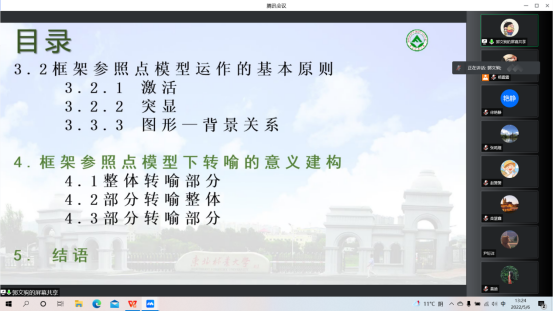 为进一步活跃学院学术氛围,创造研究生学术交流的机会,2022年5月6日,best365官方网站登录入口通过“腾讯会议”举行了研究生(语言学方向)学术论坛活动。本次学术论坛主题为转喻表征和识解的认知研究:框架参照点模型。论坛由副院长张鸣瑾主持,王宇副教授和王培松副教授为指导教师,由20级研究生杨露露和郭文驹同学主讲,部分语言学研究团队成员和语言学方向的全体研究生参会。